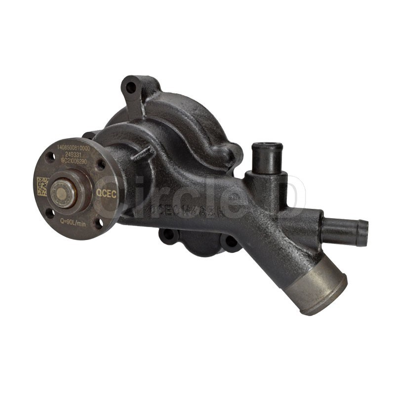 QC485, N485D. 38mm inlet hose tail. 20mm bypass hose tail. 1 x 17mm heater hose tail. 52mm outlet bolt centres. 52mm fan bolt centres.